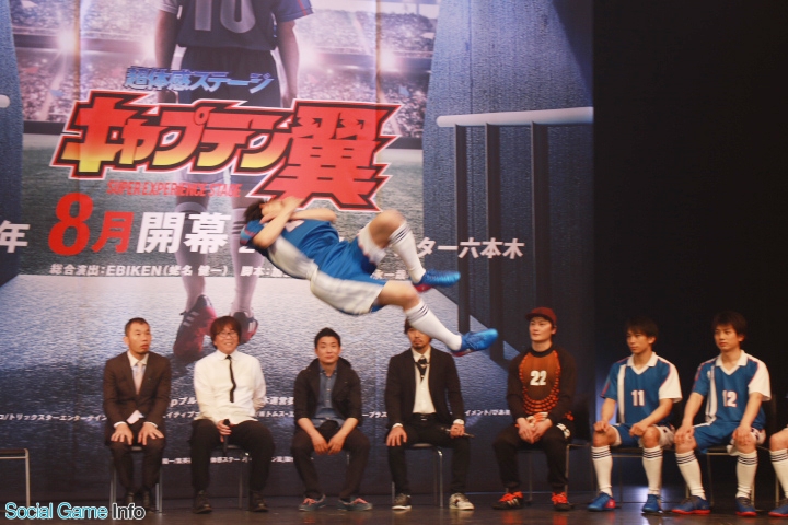 まずは、今回発表になった9名のキャストが、アニメ「キャプテン翼」のおなじみの曲に併せてパフォーマンスを披露した。アクロバティックな技が次々と繰り広げ、大迫力のステージであった。ステージで行われるパフォーマンスでは、「大空翼」役の元木さんをはじめとした身体能力がとても高いキャストを起用し、「キャプテン翼」ならではの、実際にはできないような必殺技を、限りなく現実に再現する。