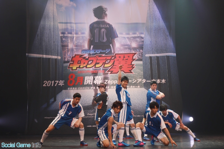 ステージには、「キャプテン翼」の原作者である高橋洋一氏、本作の総合演出を務めるEBIKENこと蛯名健一氏、脚本・演出アドバイザーの加世田剛氏、振り付けの松永一哉氏、さらに、キャストとして主人公でありサッカーの申し子「大空翼」役の元木聖也さん、天才GK若林源三役の中村龍介さん、エースストライカーの日向小次郎役の松井勇歩さん、フィールドのアーティスト岬太郎役の鐘ヶ江洸さん、フィールドの貴公子に三杉淳役の鷲尾修斗さん、北海の荒鷲の松山光役の反橋宗一郎さん、エースキラー早田誠役の土井一海さん、隼シューターの新田瞬役の加藤真央さん、パワーディフェンダー次藤洋役の皇希さんが登場。さらに、今回本作超体感ステージ『キャプテン翼』に使用される最新技術である視覚提示技術(ハプティクス技術)を開発したソニー<6758>のインタラクション技術開発部・横山氏が登壇した。