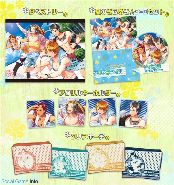 新たにグッズ化される描き下ろしイラストでは、藤城学園の3-D、皇アラン、遊馬百汰、東雲巽、瀬名竜之介の4人が海で楽しむ姿が描かれている。また、「ボーイフレンド(仮)きらめき☆ノートオンリーショップ~2学期~」ではオリジナルグッズの販売のほかにも、等身大パネルや私立藤城学園高等学校の制服やジャージの展示、鷺坂柊・如月斗真・堤誠志郎とのペアリングの展示、短冊に願い事を書く七夕企画などを実施予定だ。