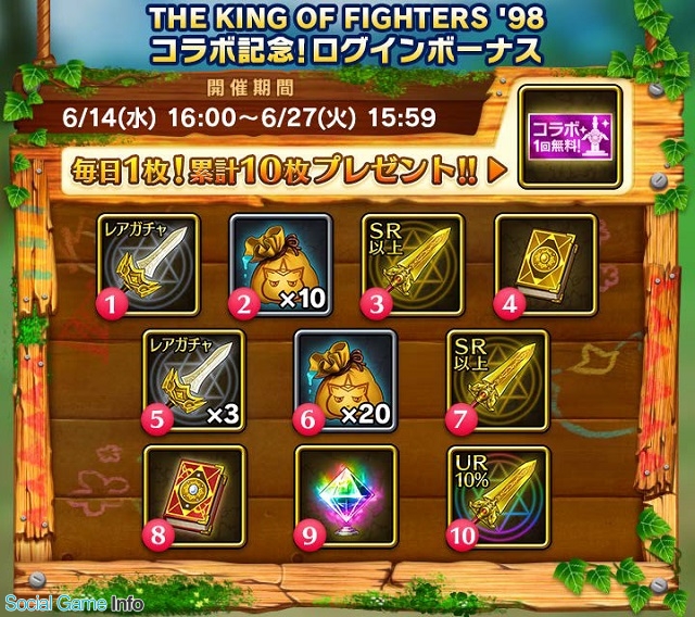 - KOF '98 コラボ単ガチャ 300 ジェム→無料チケットで最大 10 回まで無料