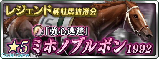 ドリコム<3793>は、本日6月15日、『ダービースタリオン マスターズ』で、非凡な才能を持った★5「ミホノブルボン1992」を「スタリオンTVスペシャル レジェンド種牡馬抽選会」に追加した。6月21日11:59まで登場する予定。今後、順次開催予定の各ブリーダーズカップレジェンドに有効な種付け権を追加していくという。