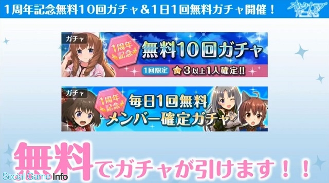 1周年記念10回ガチャが1回無料で引けるほか、1日1回無料メンバー確定ガチャが引ける。さらに属性確定&1人☆4確定ガチャも開催する。属性も5属性から1つ選ぶことができる。