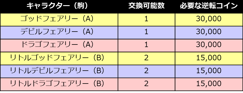 「各属性のフェアリー(A)/(B)」が期間限定で「ショップ」に登場します。なお、「逆転コイン」との交換可能数には限りがあります。