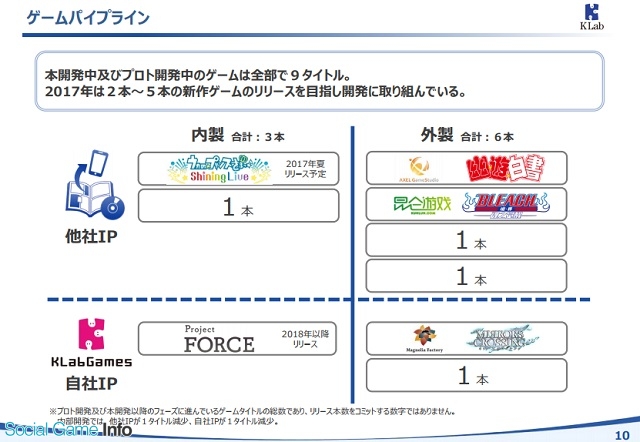 新作の開発パイプラインは9本で、内製タイトルが3本、外製タイトルが6本となっている。このうち、内製タイトルの『うたプリ』が今夏リリースの予定であり、外製タイトル3本が今期中に出る可能性があるタイトルという位置付けになっている。
