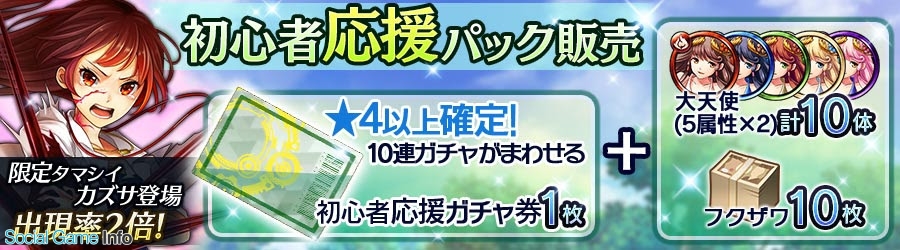 「初心者応援パック」は、フクザワ10枚の商品に、レアガチャ10連を1回まわすことのできる「応援ガチャ券」1枚がセット、全属性の大天使が各2体ずつ合計10体ついてくるオトクな商品だ。1人1回のみ購入できる。