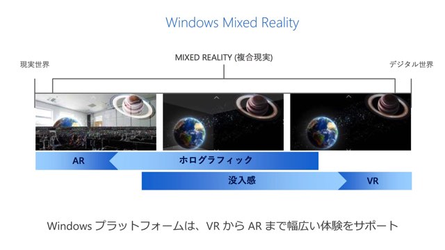 Win MRといっても、その範囲はかなり広い。Microsoftはその領域を、没入型のVR体験といったものから、現実の世界に3Dを投影するARまで含んだ領域を幅広く提供していくのだという。