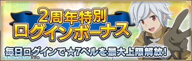 2周年を記念した特別ログインボーナスを開催中だ。期間中にログインした日数により、2周年限定の「★7ベル・クラネル」や「★7出現割合10%ガチャ券」が獲得できる。