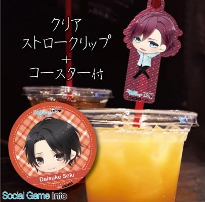 お好きなドリンクに<マトリ><警察><Revel><都築兄弟><九条家>デザインのオリジナルコースター(全21種)とクリアストロークリップ(全21種)がそれぞれランダムで1つ付いてくるコラボセットを販売します。