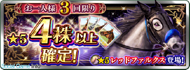 内容:有償の金の馬蹄石を使用し 10 回抽選を行うと、お一人様 3 回限り、★5 種付け権が 4 株以上確定。さらに今回は新規非凡な才能持ち★5「レッドファルクス」が登場する。