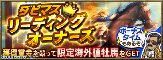 ドリコム<3793>は、「ダービースタリオン」シリーズのスマホゲーム『ダービースタリオン マスターズ(ダビマス)』において、1月25日より、「『★5 人気種牡馬 4 株以上確定!』 種抽選」を実施すると発表した。今回は、期間中一人3回限り、10回抽選で★5種付け権が4株以上確定する。また、1月26日からはリーディングオーナーズを開催する。