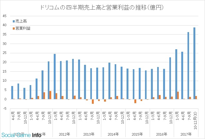 ドリコム<3793>は、1月25日、2018年3月期の第3四半期累計(4~12月)の連結業績予想の修正を発表、売上高は従来予想100億円から100億8300万円(増減率0.8%増)とほぼ予想通りでの着地となる見通しながら、営業利益は同1億7000万円から3億4100万円(同2.0倍)、経常利益は同ゼロから1億9000万円の黒字、四半期純損益は同3000万円の赤字から7500万円の黒字に大幅上方修正された。