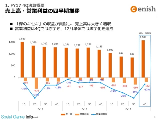 enish<3667>は、2月14日、2017年12月期の決算(非連結)を発表するとともに決算説明資料を公開した。その決算説明資料によると、昨年10月18日にリリースした『欅のキセキ』の貢献により、第4四半期期間(10~12月)の売上高は前四半期比86.1%増と大幅に増加し、TVCMなどにより広告宣伝費が増加したもの、営業赤字幅も約1億円縮小している。