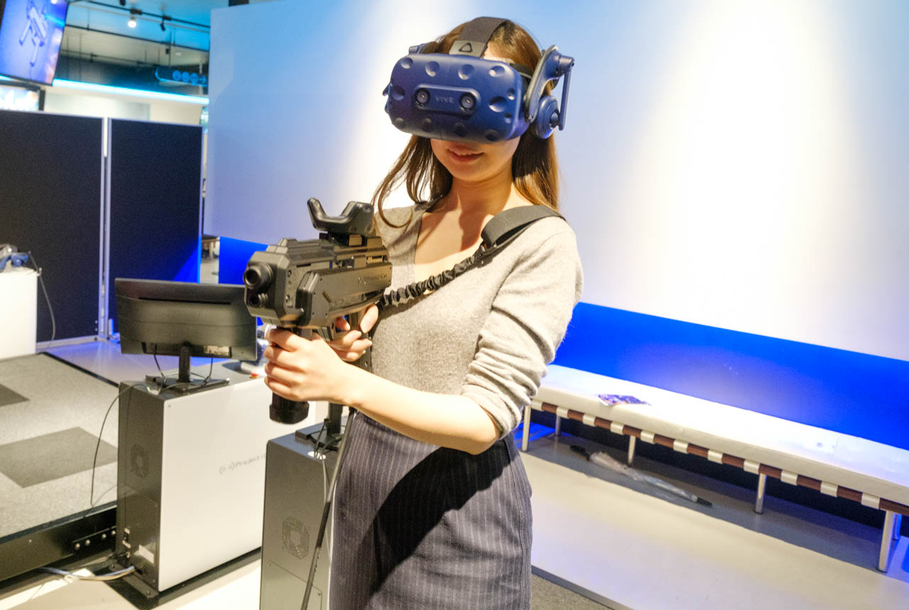 ▲この体験のために作られた専用のガンコントローラー。VIVEトラッカー付き。トリガーを引くと振動も。ストラップを肩にかけてギャラガを撃退していく。思ったほど重くはなく、軽すぎてチープということもない。絶妙です。