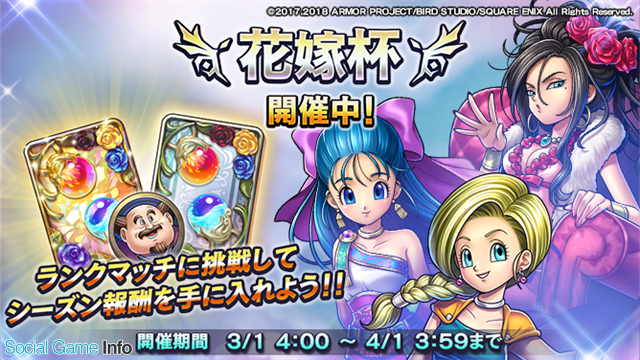 スクウェア・エニックスは、『ドラゴンクエストライバルズ』において、3月1日より、ランクマッチイベント「花嫁杯」を開催している。本イベントでは、シーズン中の最高到達ランクに応じて「花嫁スリーブ(EX)」「花嫁スリーブ(ノーマル)」「ルドマンアイコン」などがもらえる。また、今回のシーズンからダイヤモンドランクを追加。花嫁スリーブ(EX)は 、ダイヤモンド5以上に到達するともらえる。