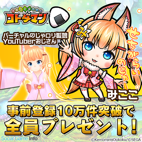 そのほかの『コトダマン』のボイスを担当する豪華声優陣は、本日以降 5 週に渡って随時発表される。また、現在開催中の事前登録キャンペーンでは、事前登録の件数に応じて、コラボレーションに登場するキャラクターの追加や、ガチャなどに使用できる「虹のコトダマ」のプレゼントが行われる。“バーチャルのじゃロリ狐娘 YouTuber おじさん”として活躍する「ねこます」さんとのコラボキャラクター「みここ」は、事前登録 10 万件突破で全ユーザーにプレゼントされる。