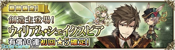 2018年3月19日(月)15時00分より、「ルートヴィッヒ・グリム」「シェヘラザード」「ルイス・キャ ロル」「ウィリアム・シェイクスピア」4人の創造主がそれぞれ期間ごとに出現する「創造主登場ガチャ」 を開催いたします!4人の創造主は最大進化・全限界突破を終え、レベル最大まで育てると、専用武器が 手に入ります!さらに、見た目や必殺技などが変わる衣装「アオトル」コスチュームも販売中!