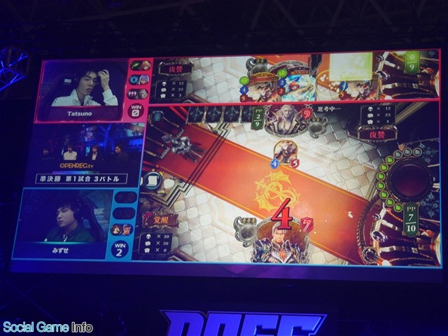 第3バトルはみずせ選手の残るドラゴンに対して、Tatsuno選手がヴァンパイアで迎え討つ形となった。Tatsuno選手は早いターンでの「ベルフェゴール」展開で復讐状態に、一方のみずせ選手も序盤からPPブーストを行い、両者理想的な動きをしていく。みずせ選手は10PPに到達すると「無謀なる戦」と「魔海の女王」のコンボで一気に体力を削っていく。しかし、手札を0にするデメリットが影響し、守りきったTatsuno選手の勝利となった。