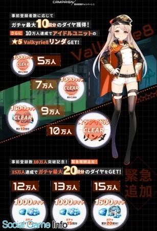 事前登録者数が10万人突破を達成したことにより、先日確定した累計ガチャ10回分相当のダイヤ3,600個に合わせ、アイドルユニットの「★5【Valkrie8】リンダ」を全員にプレゼントする、さらに事前登録者数10万人突破を記念し報酬を追加した。12万、13万人を突破するとそれぞれ追加でダイヤ1,000個の全員プレゼントが確定。15万人突破で1,600個の全員プレゼントが確定する。累計ではガチャ20回分のダイヤを全員にプレゼントする!