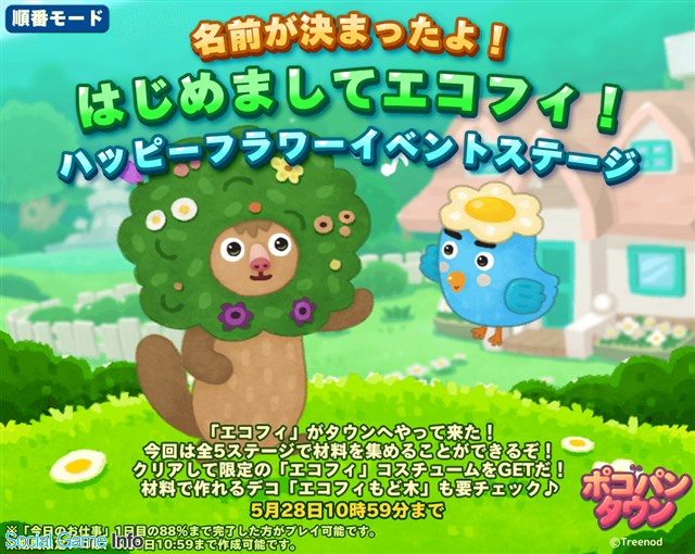 LINE<3938>は、『LINE ポコパンタウン』において、「はじめましてエコフィ!ハッピーフラワーイベントステージ 」を開催中だ。