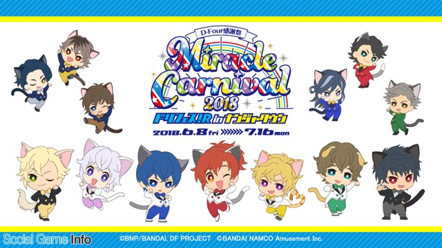 バンダイナムコアミューズメントは、東京・池袋のテーマパーク「ナンジャタウン」において、5次元アイドル応援プロジェクト「ドリフェス!R」とのコラボイベント「D-Four 感謝祭 Miracle☆Carnival 2018 ドリフェス!R in ナンジャタウン」を6月8日より開催する。