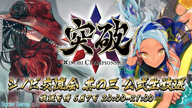 6月7日ニコニコ生放送およびYouTube Liveにて『突破 Xinobi Championship』の公式生放送を配信する。第10回目となる今回は視聴者から好評を得ている、ルーム機能を使った開発者との対戦会を実施する。ゲストには極忍ランカーのフリーライター忍者増田さんを迎える。また、今後の運営に関する情報も公開予定だ。