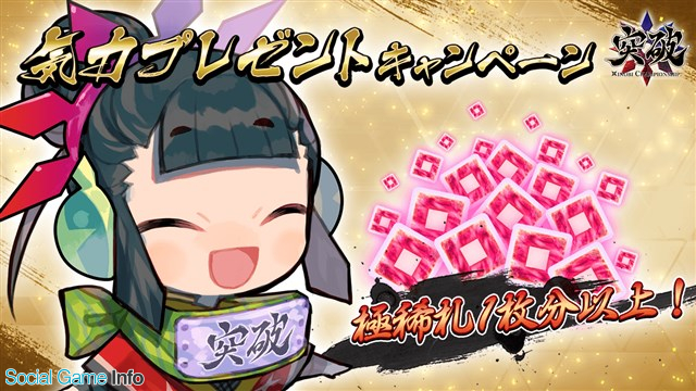 アスペクトは、スマートフォン向けカードゲーム『突破 Xinobi Championship(とっぱ シノビ チャンピオンシップ)』において、好きなシノビ札が作れる「気力プレゼントキャンペーン」を6月7日より実施することと、第10回公式生放送の配信が6月7日に決定したことを発表した。