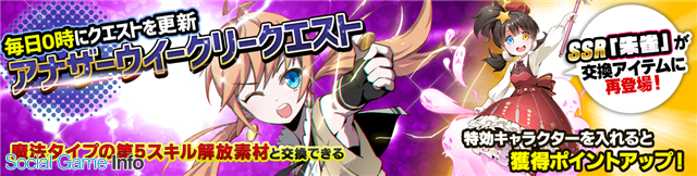 期間限定クエスト「アナザーウイークリークエスト」を公開しました。無料で毎日5回挑戦でき、「ウイークリーポイント」が入手できます。「ウイークリーポイント」では、人気SSR「朱雀」や、魔法タイプの第5スキル解放素材と交換が可能です。