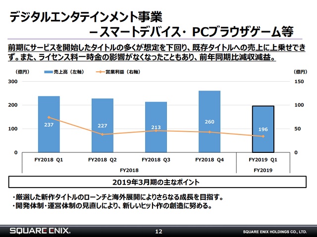 スクウェア・エニックス・ホールディングス<9684>は、8月7日に発表した第1四半期(4~6月)決算で、スマートデバイス・PCブラウザゲームが減収減益だったことを明らかにした。具体的な数字は、売上高のみ開示されており、前四半期比24.6%減の196億円と久々に200億円の大台を割り込んだ。同社では、前期にサービスを開始したタイトルの多くが当社の想定を下回り、既存有力タイトルの売上高に上乗せをするに至らなかったことに加えて、ライセンス料一時金の影響がなくなったことを主な理由としてあげた。同社では、厳選した新作タイトルのローンチと海外展開によりさらなる成長を目指す、としている。開発体制・運営体制の見直しも行うとのこと。