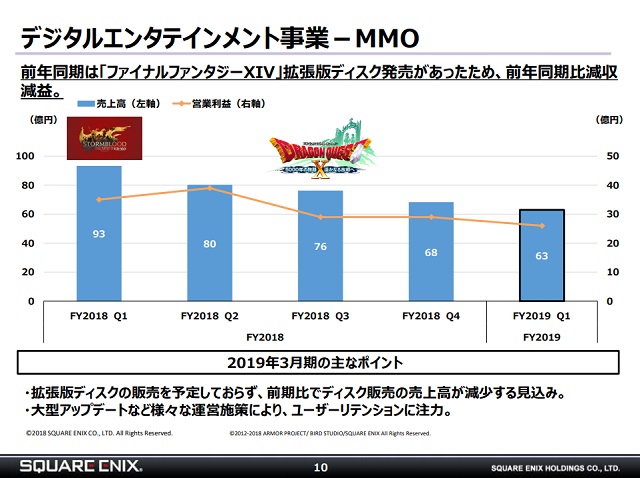 MMOPRGも減収減益だった。こちらも売上高のみ実数値が公開されており、前年同期比32.2%減の63億円だった。前年同期に発売された『ファイナルファンタジーXIV』拡張版ディスクに相当するものがなかったとのこと。今期は拡張版ディスクの販売の予定はなく、ディスク販売の売上高は減少する見通し。大型アップデートなどの施策でユーザーリテンションに注力する考えだ。