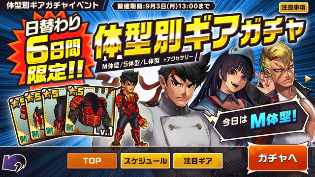 日替わり6日間限定の「体型別ギアガチャイベント」が本日8月28日(火)より開催決定!ギアのサイズがM/S/Lの体型別に日替わりでガチャが開催されます。 ガチャは毎日11時に切り替わるので、 このチャンスに手に入れたかったギアを獲得しよう!