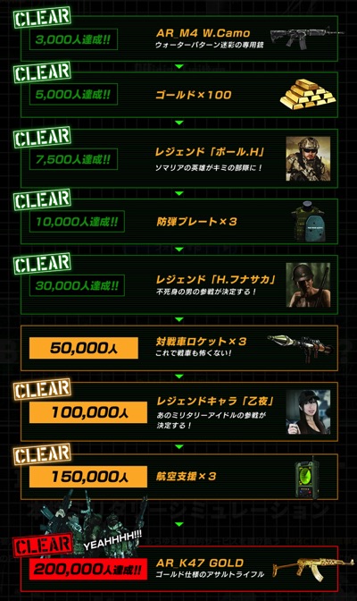 配信前に実施の事前登録キャンペーンでの、20 万人突破を受けて、ゲーム内で役に立つ様々な特典をプレゼントしている。PMC 運営に欠かせないゴールドや、部隊の武装を強化できる銃器など、スタートダッシュできる特典の配布期間は、10月31日23時59分までとなっている。