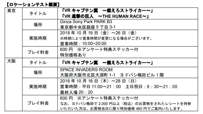 タイトー、ソニー・ミュージックコミュニケーションズ、ハシラスは、共同プロジェクトとして開発中の VR アトラクション「VR キャプテン翼 ~燃えろストライカー~」および「VR 進撃の巨人 ~THE HUMAN RACE~」のロケーションテストを東京と大阪で開催すると発表した。