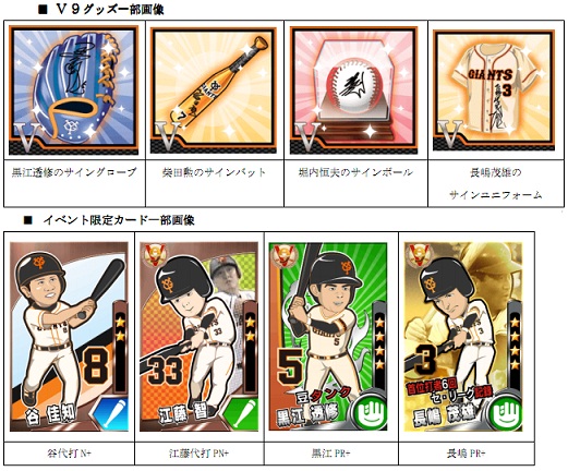さらに限定特訓中、サインボールやサインユニフォーム、サインバット、サイングローブ各6種ずつのV9グッズやイベント限定カードを入手することがあり、V9グッズの各種コンプリートをする毎にV9選手の限定レアカードが入手できる。全てのV9グッズをコンプリートするとV9の名投手「堀内恒夫限定 PR カード」を入手可能だ。
