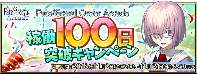 『Fate/Grand Order Arcade』が全国のゲームセンターで稼働を開始した 7月26日から 100日を突破したことを記念して、『FGO Arcade』ゲーム内にて「稼働 100日突破キャンペーン」を開催する。