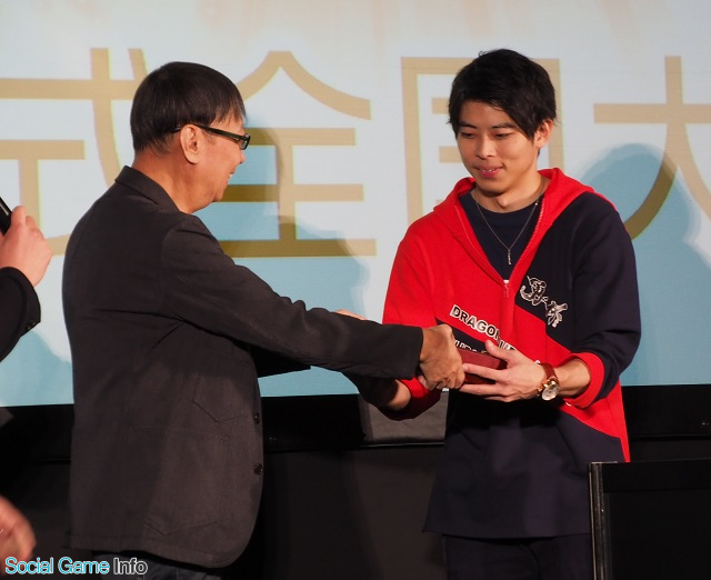 大会の表彰式には、本作プロデューサーの二木氏に加えて、ドラゴンクエストシリーズの生みの親でゲームデザイナーの堀井雄二氏がサプライズゲストとして登壇すると会場からは大歓声があがった。堀井氏は「おめでとう! 夏に優勝できなくて悔しくて、すごく練習されたと聞きました。本当におめでとうございます!」とLv99 アカギ選手をたたえた。そして総評として、「どの試合もすごい戦いでした。ヒーローカードが出てくるので、次回はどんな戦いになるのか楽しみです。頑張ってください!」とコメントした。