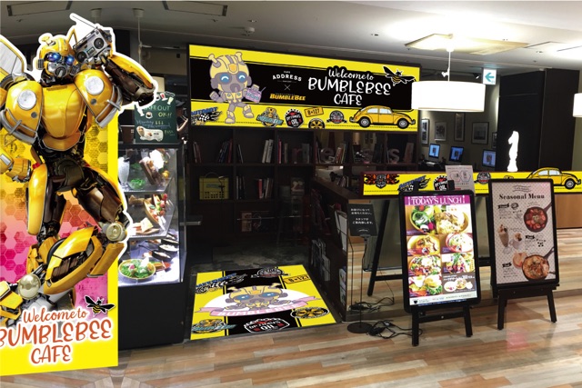 トランスフォーマーの初代アニメ作品『戦え!超ロボット生命体トランスフォーマー』や歴代映画作品でのバンブルビーの活躍シーンをピックアップした映像の上映や、バンブルビーの3D風写真が撮れるランチョンマットなど、カフェ内のいたるところにバンブルビーが登場する。
