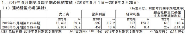 続く2019年5月通期は、売上高190億円(前期比61.9%増)、営業利益11億円(同53.4%増)、経常利益10億9400万円(同55.4%増)、最終利益6億6000万円(同62.4%増)を見込む。