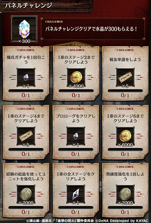 なお、 対象のキャラクターと兵器は、 チュートリアルをクリアすると手に入れることができる。 また、 すべての条件を達成すると、 最大70個の「水晶」を獲得できる。 なお、 「水晶」はガチャを引けるほか、 「行動力」の回復などに使用できる。