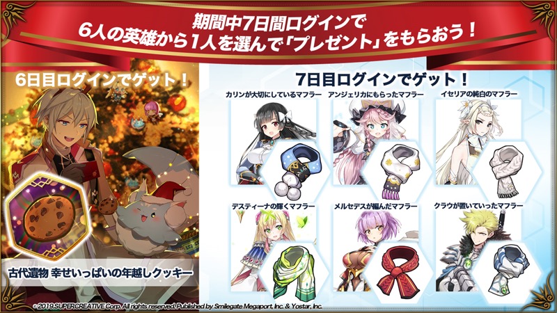 またあわせてクリスマスログインボーナス開始になる。毎日ログインすると英雄からボーナスがプレゼントされる。開始日より欠かさずログインするとちょうどクリスマスになるため、毎日のログインは必須となりそうだ。