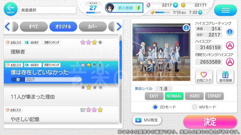 アニプレックスは、今春配信予定のリズムゲームアプリ『22/7 音楽の時間』(通称:ナナオン)の公式Twitterで、ゲーム画面を先行公開している。ハ・ン・ドと共同開発するアイドル育成リズムゲームだが、一部楽曲は22/7メンバーが歌って踊る3Dモードと、MVを見ながらプレイできるMVモードが用意されているという。楽曲は、「理解者」や「僕は存在していなかった」など22/7のオリジナル楽曲のほか、アイドルソングからアニメソングまで有名楽曲をカバーしている。