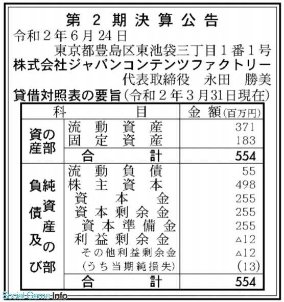 ジャパンコンテンツファクトリーの2020年3月期(第2期)の最終損失は1300万円と赤字転落となった。前の期(2019年3月期)の最終利益は200万円だった。「官報」に掲載された「決算公告」で判明した。同社は、クールジャパン機構とNTTぷらら、YDクリエイション、文藝春秋、イオンエンターテイメントが共同で設立した会社で、ファンド「ジャパンコンテンツファクトリー投資事業有限責任組合」の運用を行っている。運用総額は最大83億円とのこと。