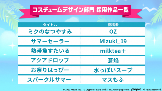 今回のテーマは「夏!」。審査の結果、BGM10作品、コスチューム6作品、ペットデザイン10作品の採用が決定。後日piapro(ピアプロ)公式コラボページでも採用作品が掲載される。