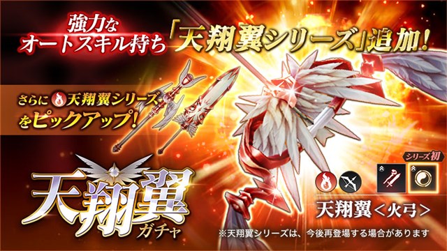 新火属性SSR武器「天翔翼<火弓>」や、火属性の天翔翼シリーズ「天翔翼<火杖>」「天翔翼<火大剣>」がピックアップされた「天翔翼ガチャ」を開催する。