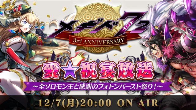 12月7日20:00から、感謝の気持ちを込めた3周年特別番組「愛★祝宴放送!全ソロモン王と感謝のフォトンバースト祭り!」を配信する。本番組では、『メギド72』のこれまでの振り返りから最新情報まで、盛りだくさんの内容でお届けする予定。また、『メギド72』グッズが当たる視聴者プレゼントキャンペーンも実施予定。