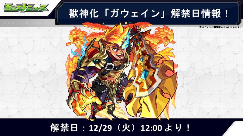 ミクシィ<2121>は、『モンスターストライク』で、12月29日12時より、「ガウェイン」の獣神化を解禁する。「闘気溢れし太陽の騎士ガウェイン」となる。