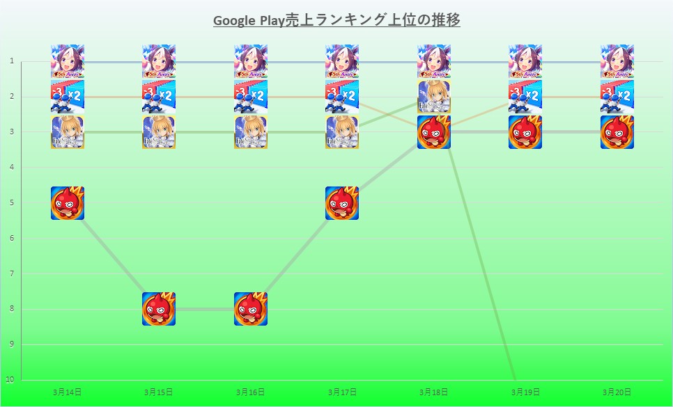 3月9日10時現在のGoogle Playの売上ランキング(ゲームカテゴリー)は、前日に続いてトップ30圏内の順位に動きは見られず、Cygamesの新作『ウマ娘 プリティーダービー』が9日連続で首位となった。