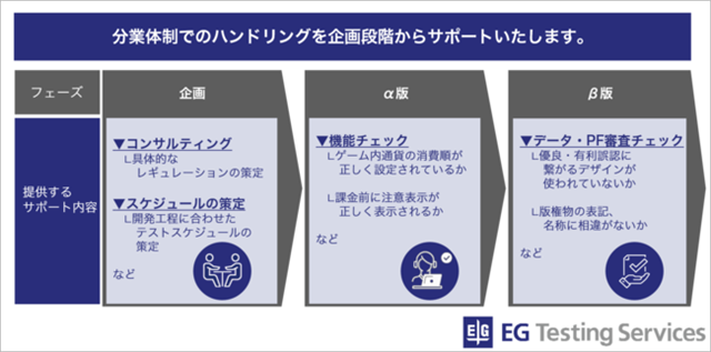 イー・ガーディアン<6050>のグループ会社EGテスティングサービスは、開発中のゲームが定めた基準通りの設計になっているかを検査する「開発レギュレーションテスト」を3月17日より提供開始した。本サービスは、ゲームパブリッシャーがディベロッパーに求める、ゲーム内通貨(無償、有償)の使用順などの機能面のルールや、デザイン(露出度、暴力的な表現)の基準など各種レギュレーションの策定・コンサルティングを提供する。特に、各工程の開発の進行にあわせてそれらの基準に沿って実装されているかどうかのチェックまでを行うことで、各社の認識ミスや不十分な理解から生じる仕様のミスをなくし、円滑なゲーム開発をサポートすることが可能だ。