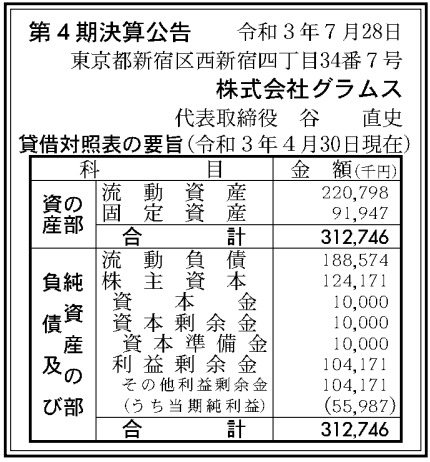 gumi<3903>子会社のグラムスの2021年4月期(第4期)の決算は、最終利益が前の期比58.6%増の5598万円だった。前の期(2020年4月期)の実績は3530万円だった。本日(7月29日)付の「官報」に掲載された「決算公告」で判明した。