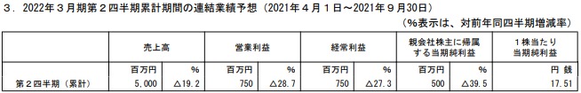 2022年3月通期の見通しは非開示。9月中間の連結業績予想のみ開示しており、売上高50億円(同19.2%減)、営業利益7億5000万円(同28.7%減)、経常利益7億5000万円(同27.3%減)、最終利益5億円(同39.5%減)とした。