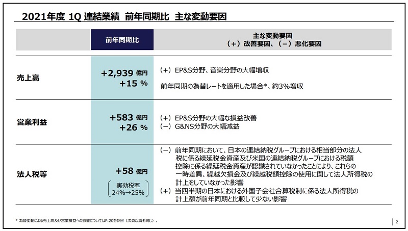 ゲーム&ネットワークサービスが減益となったものの、テレビ、デジタルカメラ、オーディオ・ビデオなどの採算性が大きく改善したことが主な増益要因となった。